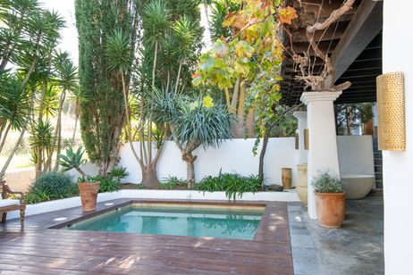 Baladre Suite Deluxe, cama de matrimonio, sofá cama, baño con ducha, terraza exterior, bañera externa y piscina.
